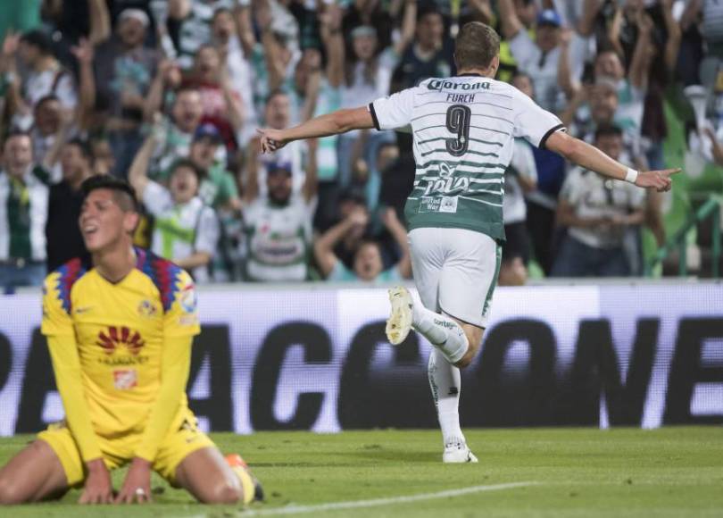 This “Plan B” led directly to two of the home side’s four goals. The first of the night, scored by midfielder Osvaldo Martínez, came from an attacking throw-in for Santos down América’s right hand side. Furch took left-back Jesús Angulo’s throw down on his chest and held the ball up on the right corner of América’s box before finding Djaniny with a square ball. Djaniny then laid off for Martínez to shoot. On the final goal for Los Laguneros, Furch, with his back to goal, contested a long ball out from the back with América center-back Edson Álvarez. As Álvarez tugged away at the Santos number 9’s shirt, both players went down, allowing the ball to bounce past both of them and into the path of Santos substitute Edwuin Cetré, who finished cooly beyond América keeper Augustín Marchesín. Although his two goals were crucial to his team’s victory, perhaps more important for Santos is the tactical flexibility a player like Furch gives them in attack.