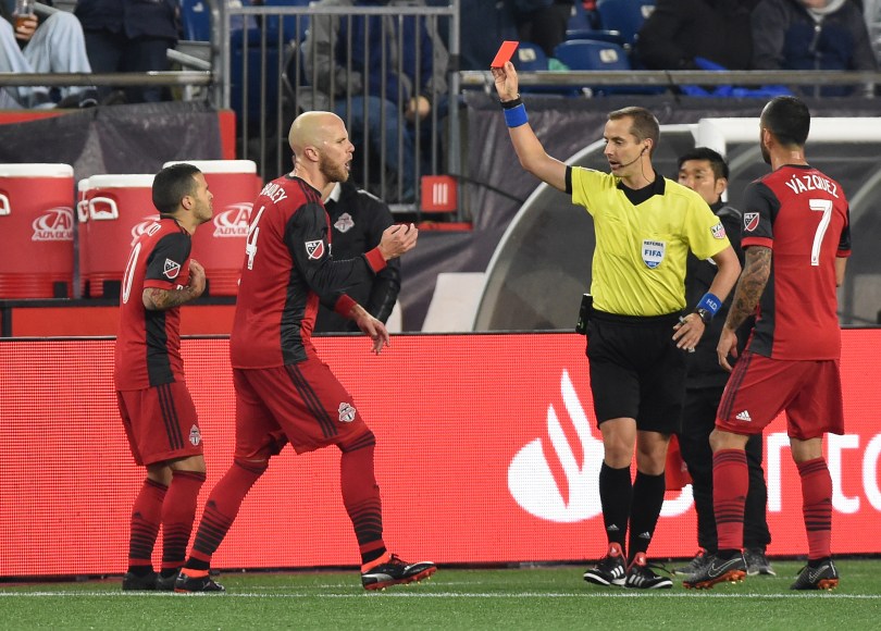 In his enthusiasm following the goal, Giovinco picked the ball out of the net and began running toward the halfway line. When Revs midfielder Wilfried Zahibo tried to punch the ball out of Giovinco’s arms, Giovinco responded by putting his hands in Zahibo’s face. After consulting with VAR, referee Mark Geiger gave Giovinco a red card, and Toronto was down to 10 men.